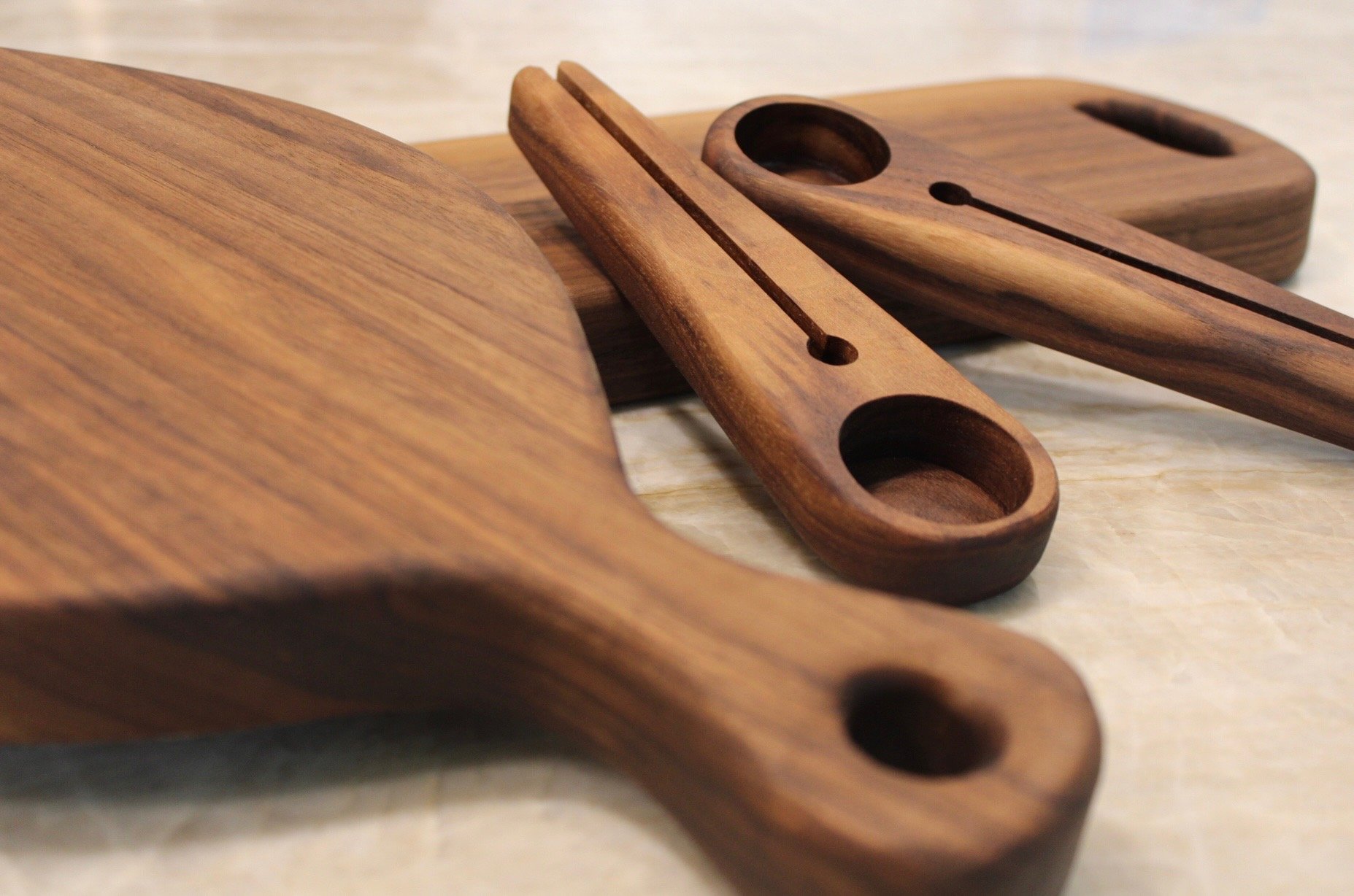 Handcrafted solid wood cutting boards and matching measuring spoons, made from dense hardwood for durability and a rich natural finish. Each piece is shaped, sanded, and finished by hand to highlight the grain and ensure a smooth feel.